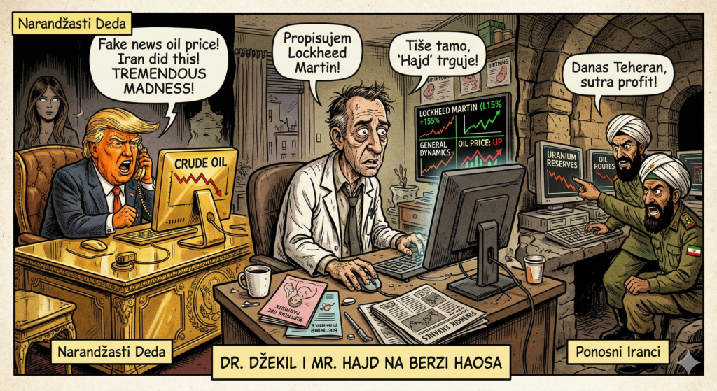 A s druge strane su ponosni Iranci. Ludi, prkosni i smrtno ozbiljni. Oni ne blefiraju. Oni čekaju, a dok čekaju, cena nafte igra kolo po mojim nervima. Ako deda odluči da pokaže mišiće, ja moram biti spreman. Kupujem Lockheed Martin i General Dynamics. Svaki put kad čujem zvuk vojnih bubnjeva, moje akcije polete kao njihovi presretači. Uzeo sam sve što miriše na barut. Čak sam razmišljao i o Boeingu, ali sam odustao. Ne ulažem u firme kojima avioni padaju češće nego što ja gubim strpljenje sa kolegama.